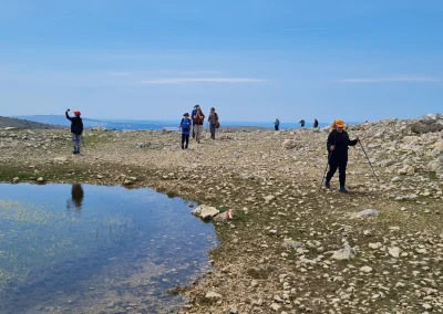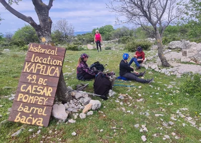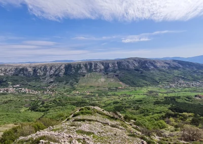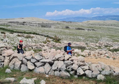 Our route leads to the Vele Rike springs, offering a stunning view of Vrbnik Field and Vrbnik itself. Particularly striking are the dry stone walls and stone heaps guiding us to the so-called “Moon Plateau” – a rocky, infertile area whose appearance truly resembles the surface of the Moon.